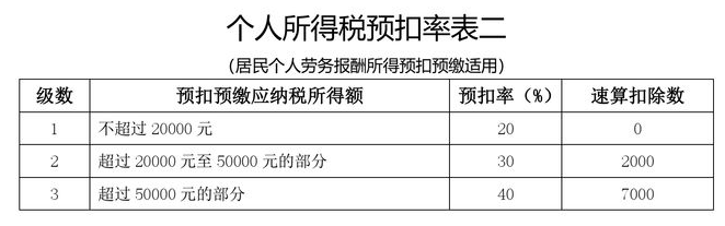 勞務(wù)報酬所得適用20%至40%的超額累進預(yù)扣率(見《個人所得稅預(yù)扣率表二》)。